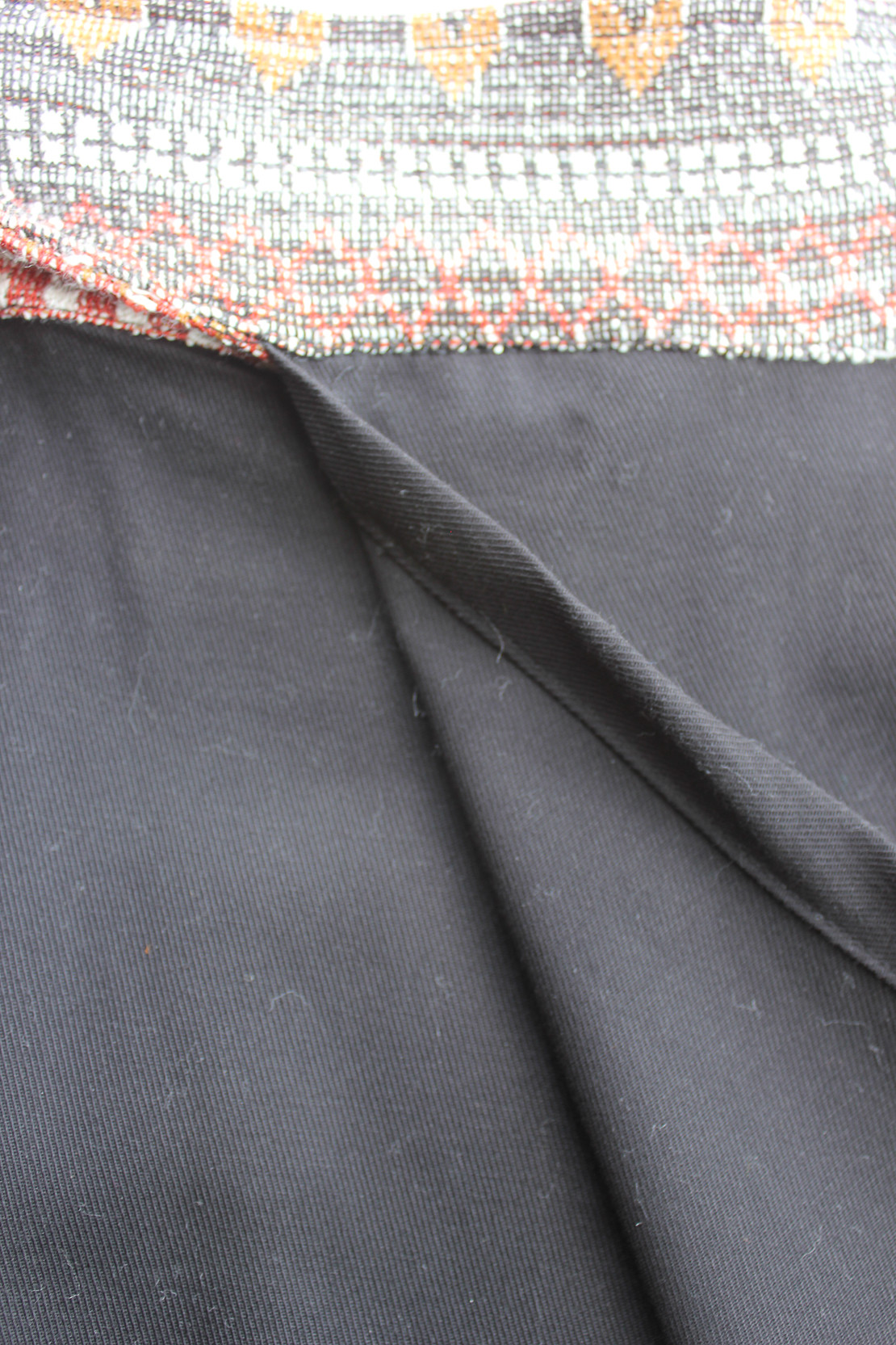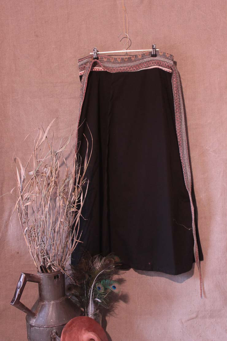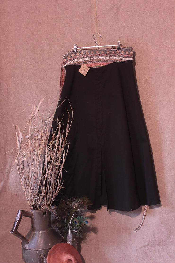 Falda cruzada a modo de pareo. Pieza doble posición, la cintura esta pensada con anillas de latón para poder utilizarlo como un peto entallado en la cintura.