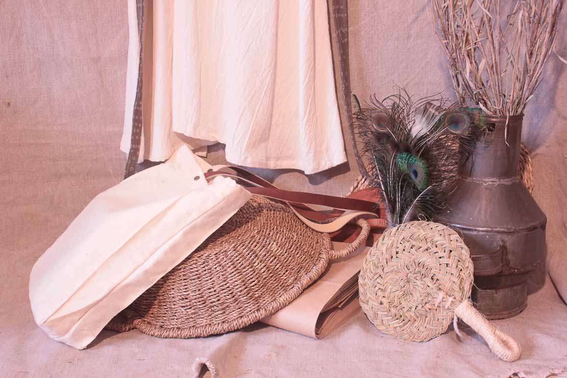 Bolso de un algodón antiguo tejido a telar con asas de cuero