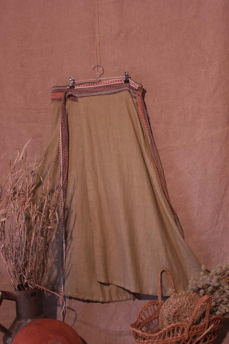 Falda cruzada a modo de pareo. Pieza doble posición, la cintura esta pensada con anillas de latón para poder utilizarlo como un peto entallado en la cintura.