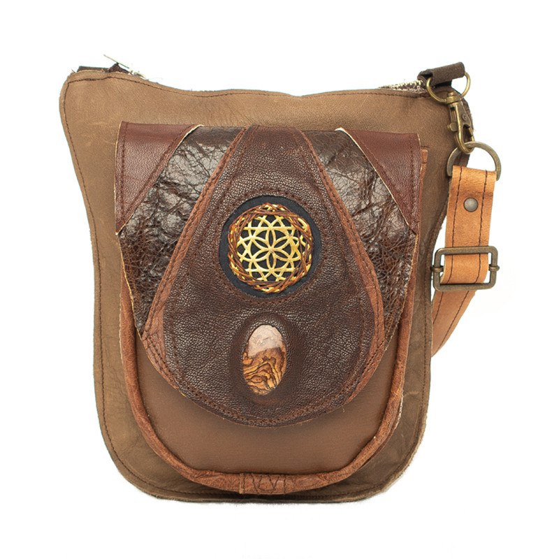 La solapa va acompañada para potenciar su trabajo con una geometría sagrada de latón encastada en la própia piel.