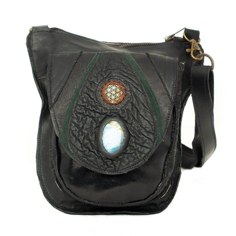 La solapa va acompañada para potenciar su trabajo con una geometría sagrada de latón encastada en la própia piel.
