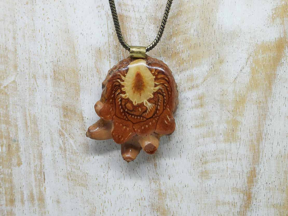 Estas piñas han sido recolectadas y seccionadas en vivo, pulidas a mano y trabajadas conscientemente para crear de cada una de ellas un objeto de poder o talisaman para finalmente con una capa de resina protegerlas y dejarlas congeladas en esa forma.