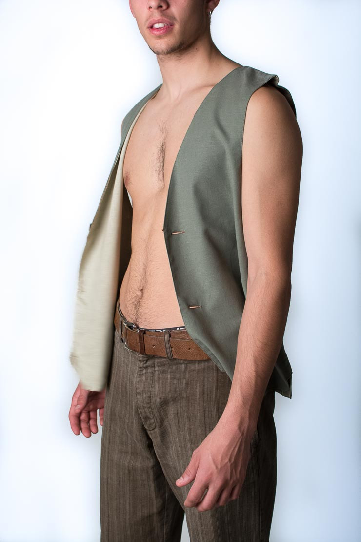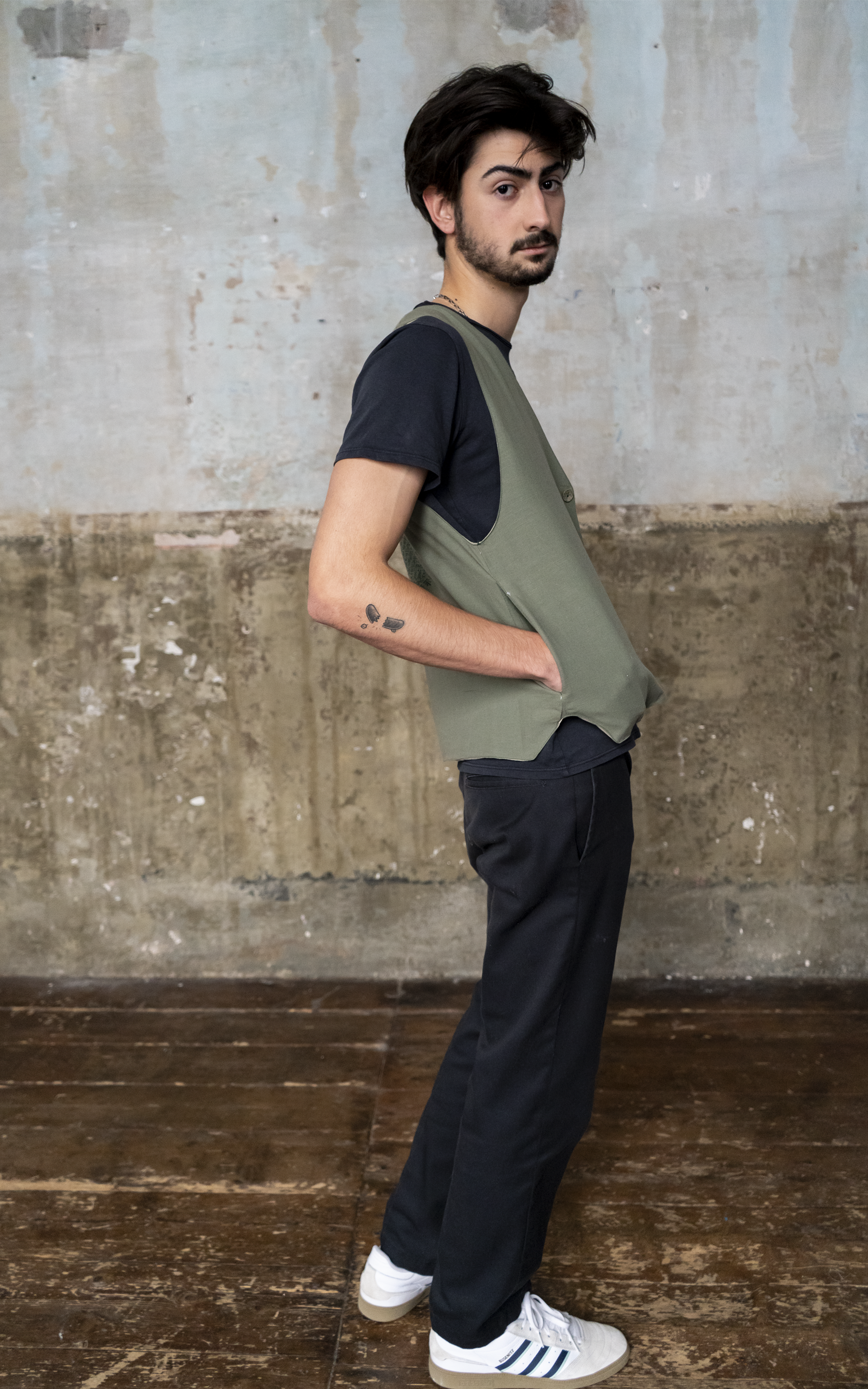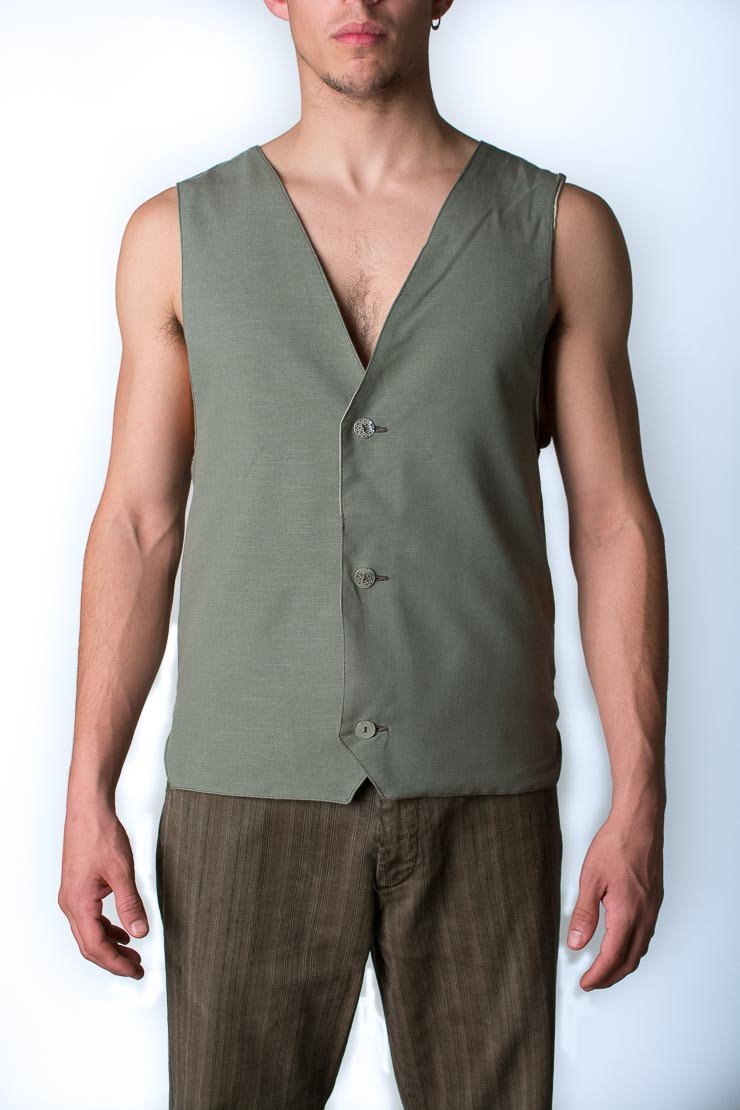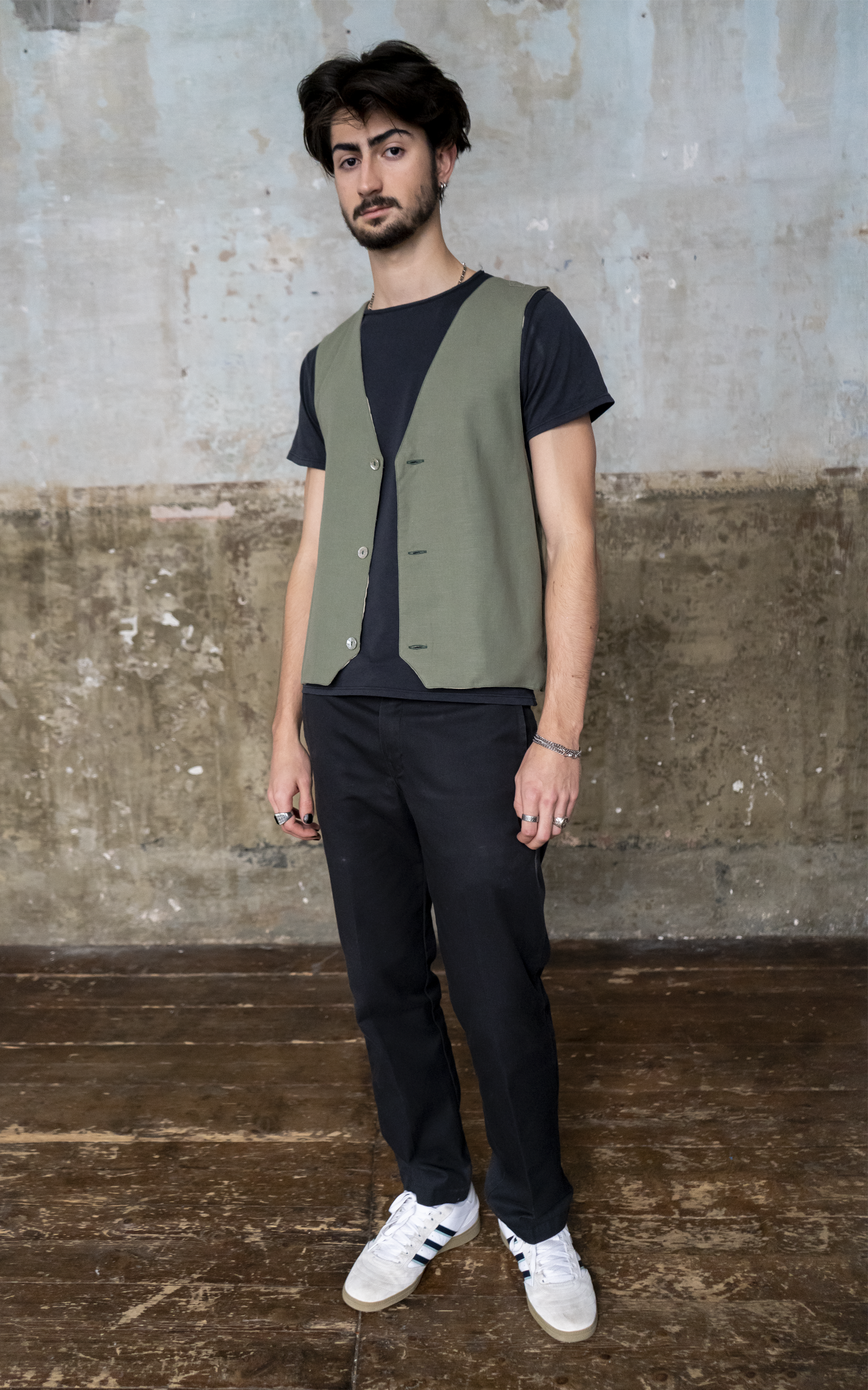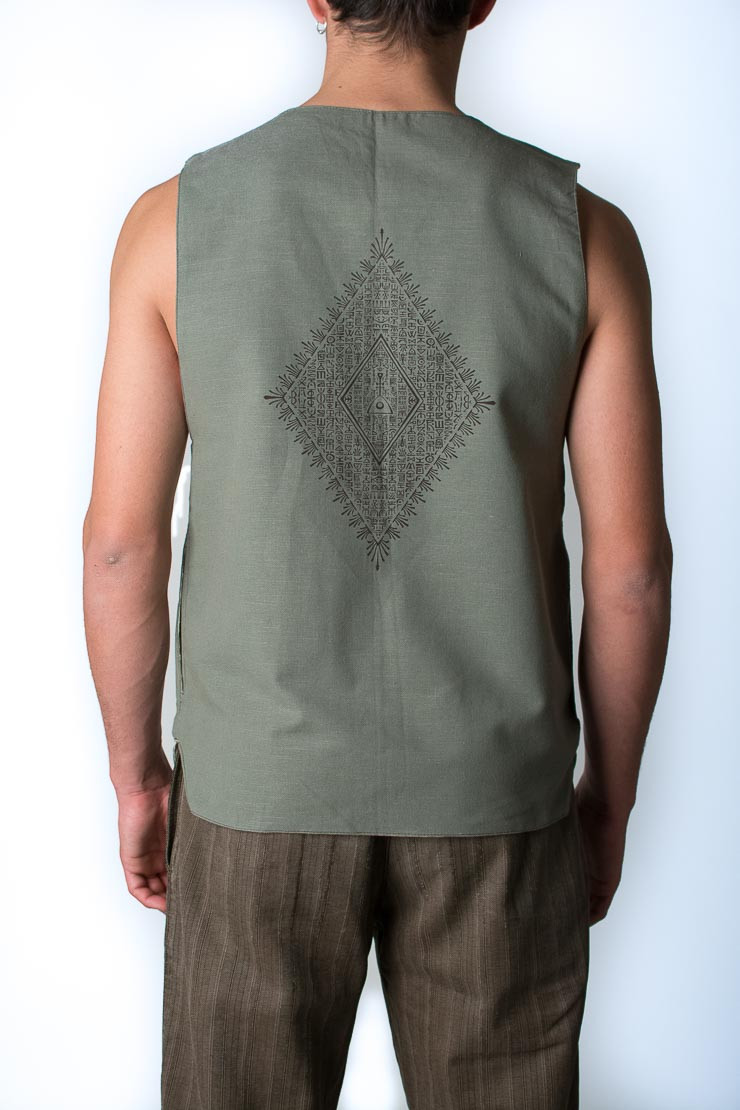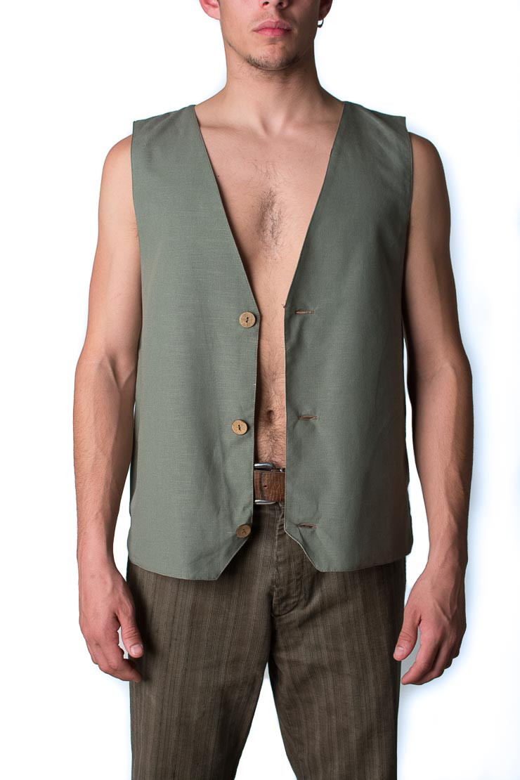 Chaleco de lino en verde e interior de beige con serigrafía del artista Metoikos, acabados con botones de madera.