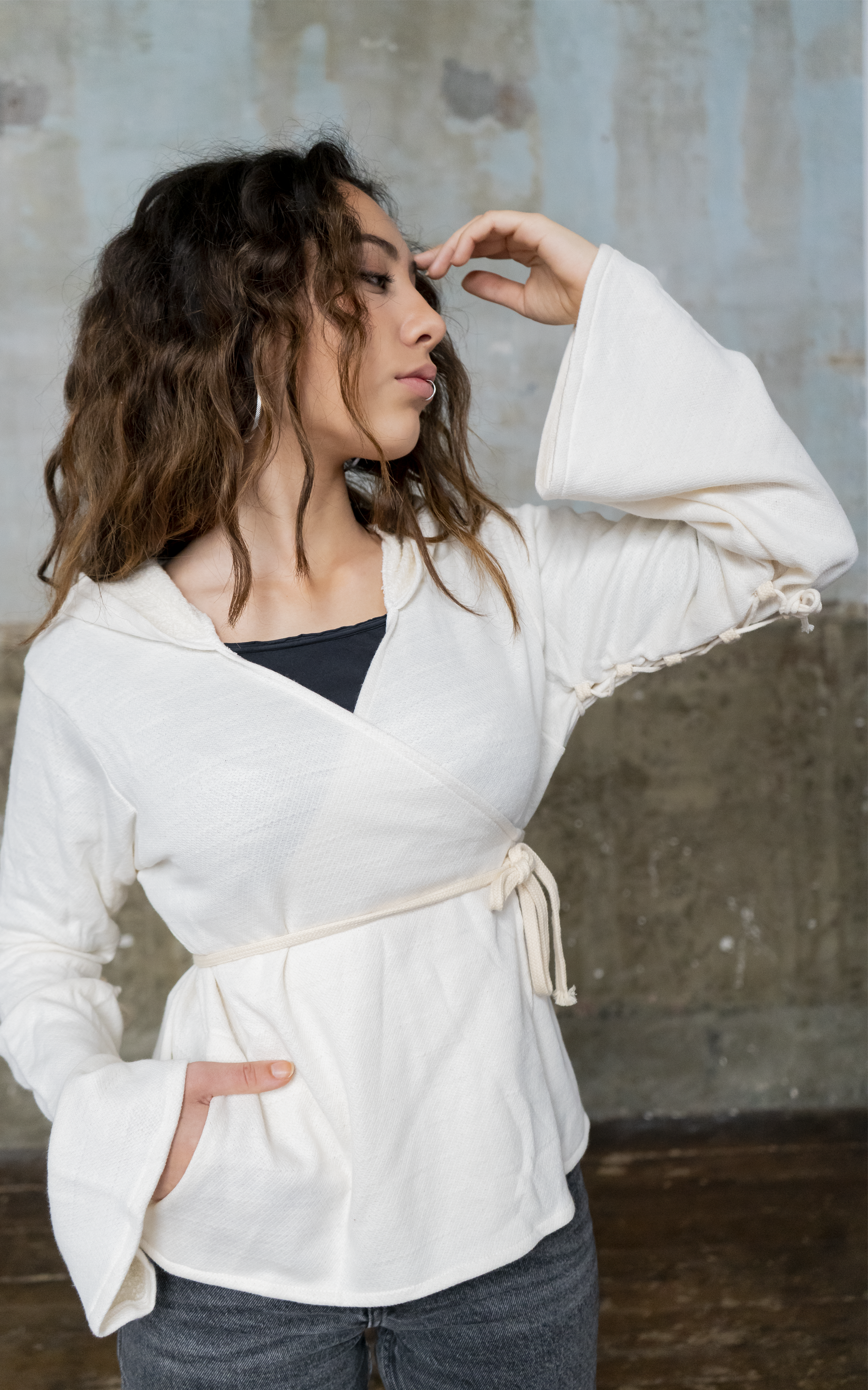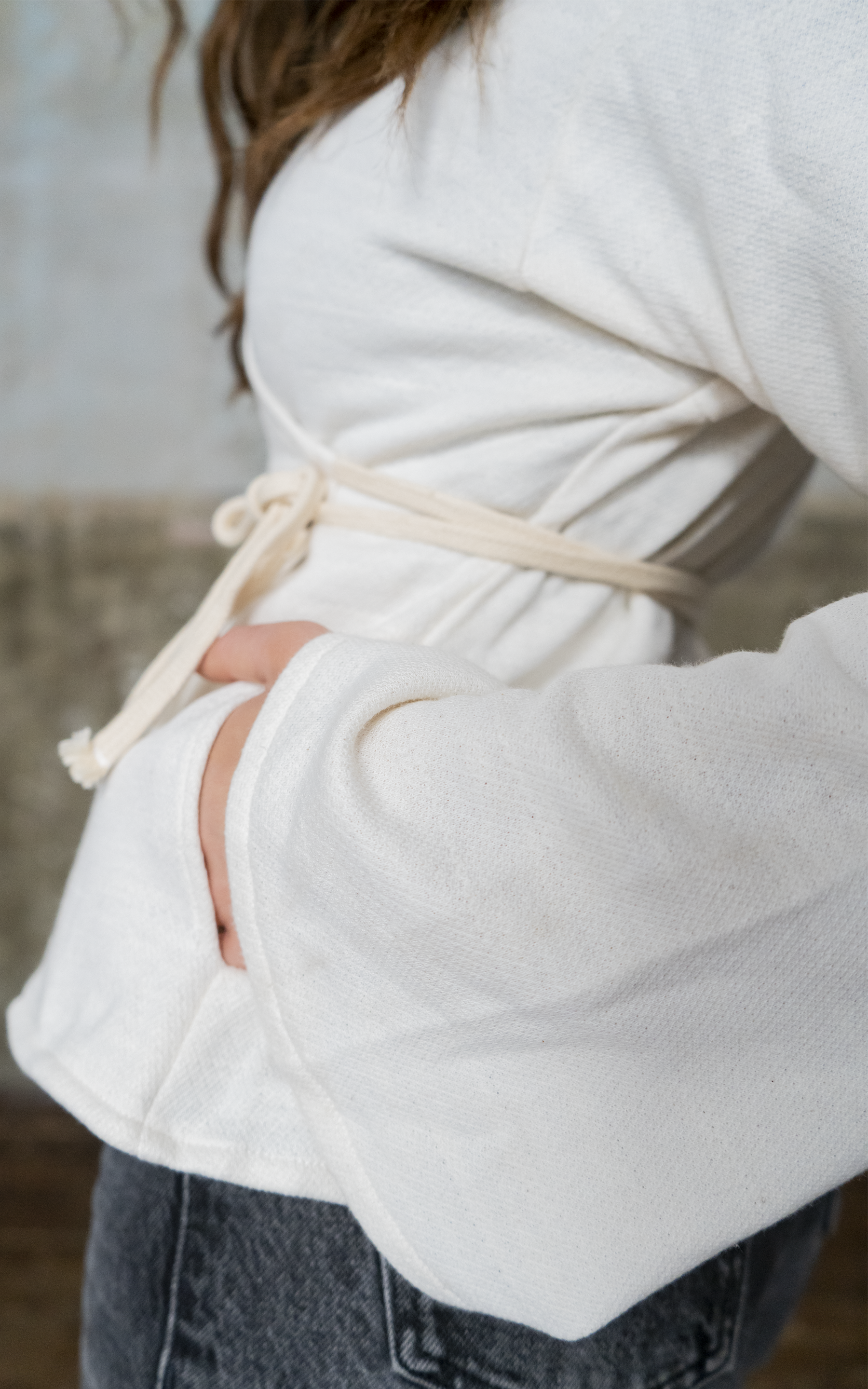 Chaqueta Toda talla de felpa fina de algodón 100%, cruzada en la cintura, con bolsillos y mangas acampanadas con detalle de cuerda en ellas.
